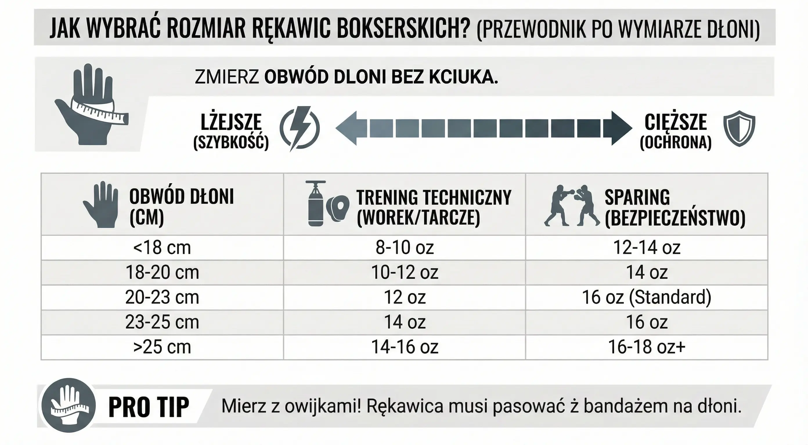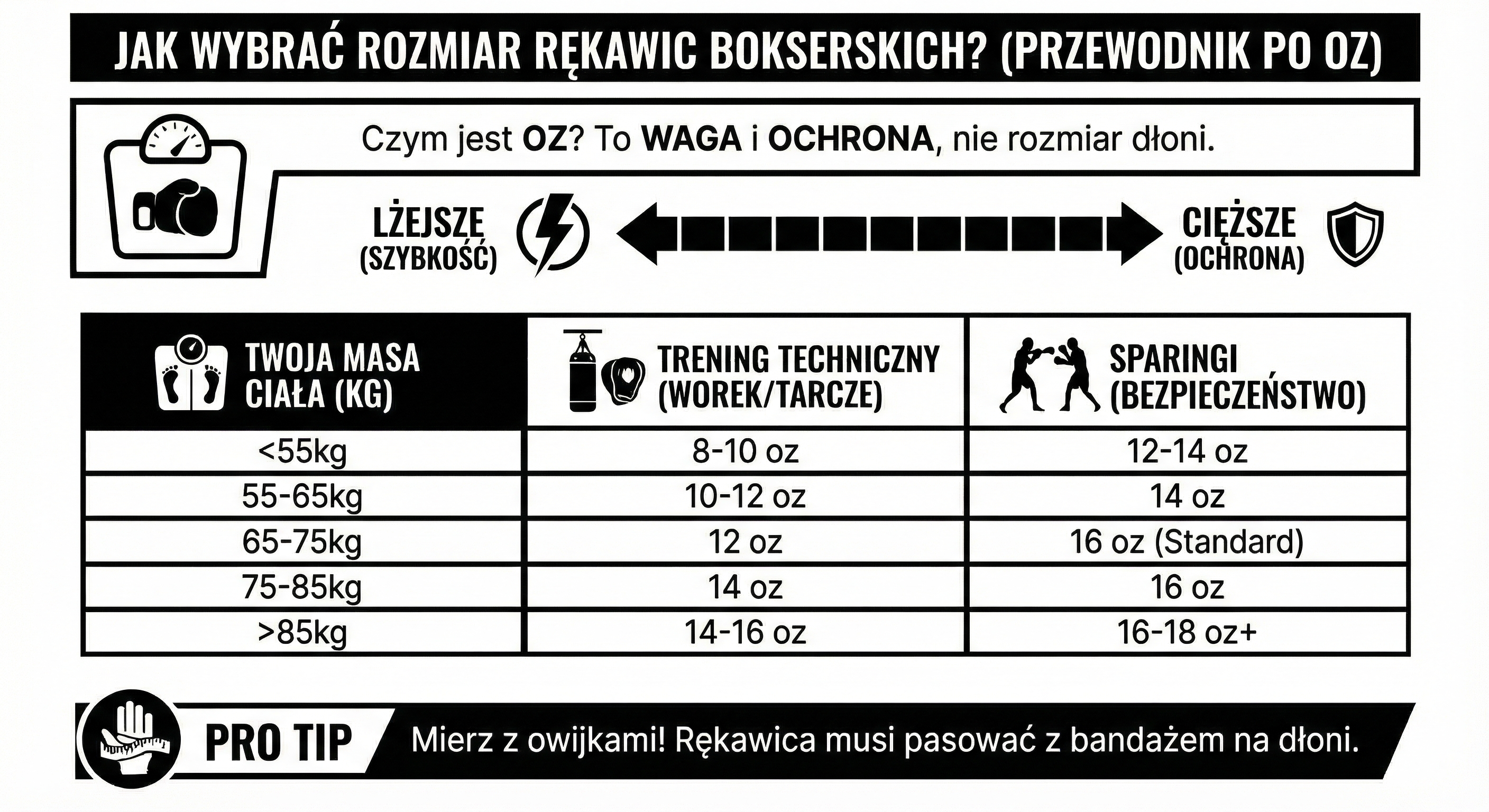 - Rozmiar rękawic bokserskich określa się w uncjach (oz) – im więcej oz, tym większa ochrona, ale mniejsza dynamika.